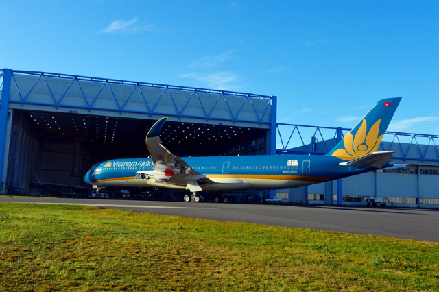 - Vietnam Airlines’ first Airbus A350-900 aircraft has left the paint shop, revealing a new livery for the carrier.