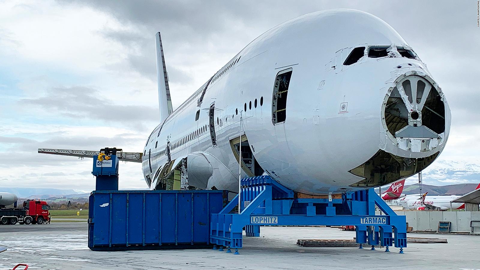 “Additionally, Boeing placed a sophisticated jacking and crib mechanism under each aircraft to reduce structural stress for the initial modification phases.”